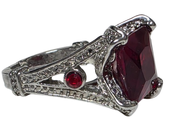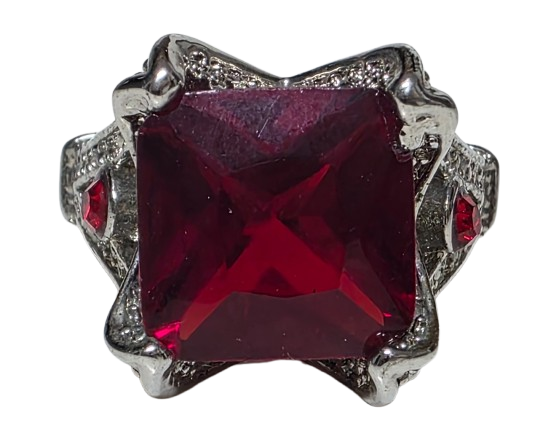 Sortija metal rodiado con circonita rectangular color granate.