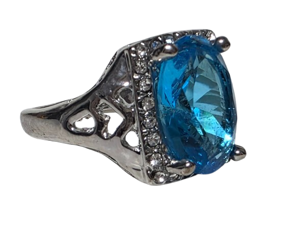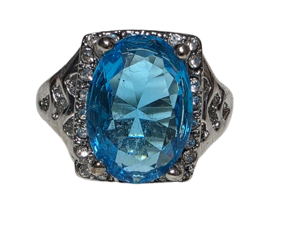 Con circonita oval color topacio azul bordeada de circonitas blancas.